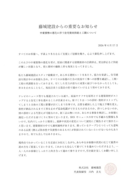 藤城建設からの重要なお知らせ