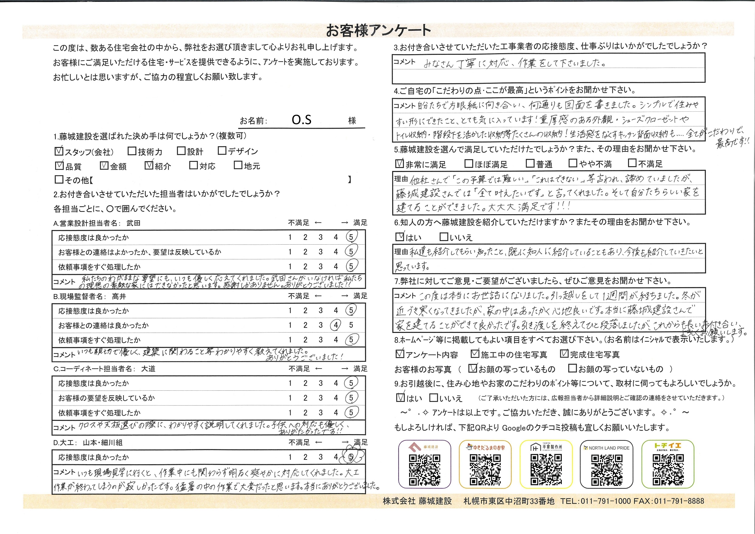 【2026.1.31UP】自分たちらしい家を建てることができました。 余市郡余市町O.S様(30代・3人家族) DATA 36坪3LDK 設計営業/武田 現場監督/髙井 コーディネート/大道 大工/山本・細川大工 2025.10 《こだわりポイント》 ☆重厚感のある外観 ☆シューズクローゼットや トイレ収納・階段下を活かした収納等たくさんの収納 ☆生活感をなくすキッチン背面収納 私たちのわがままな要望にも、いつも優しく応えてくれました。 武田さんがいなければ私たちの理想の素敵な家にはできなかったと思います。 感謝しかありません。ありがとうございました!! 建築に関わること等わかりやすく教えてくださいました。 クロスや天板選びの際に、わかりやすく説明してくれました。 子供への対応も優しく、ありがたかったです。 いつも見学へ行くと、作業中にも関わらず明るく爽やかに対応してくれました。 大工作業が終わってしまうのが寂しかったです。 猛暑の中の作業で大変だったと思います。 みなさん丁寧に対応してくださりました。 本当にありがとうございました。 自分たちで方眼紙に向き合い、何通りも図面を書きました。 シンプルで住みやすい形にできたこと、とても気に入っています! 重厚感のある外観、シューズクローゼットや トイレ収納・階段下を活かした収納等たくさんの収納 生活感をなくすキッチン背面収納も…全てがこだわりで最高です!! 他社さんで「この予算では難しい」「これはできない」等言われ、諦めていましたが、 藤城建設さんでは「全て叶えたいです」と言ってくれました。 そして自分たちらしい家を建てることができました。 大大大満足です!! 私達も紹介してもらい知ったこと、既に知人に紹介していることもあり、 今後も紹介していきたいと思っています。 この度は本当にお世話になりました。 引っ越しをして1週間が経ちました。 冬が近づき寒くなってきましたが、家の中はあったかく心地良いです。 本当に藤城建設さんで家を建てることができて良かったです。 引き渡しきを終えてひと段落しましたが、 これからも長いお付き合いよろしくお願いします。